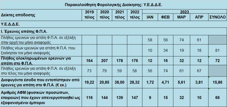 Στις υποθέσεις που εντοπίστηκαν παραβάσεις απενεργοποιήθηκαν τα ΑΦΜ 66 εμπλεκόμενων. Αναλογικά ο αριθμός τους είναι από τους υψηλότερους τα τελευταία χρόνια.