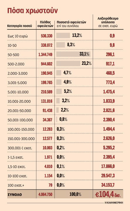 • Το 87,4% των οφειλετών (3.554.463 οφειλέτες) χρωστάει έως 5.000 ευρώ και συνολικά το 2,4% (2,465,8 δισ.) του συνολικού ληξιπρόθεσμου υπολοίπου.